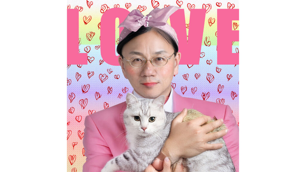 次の担当の方は人物背面にピンク色のLOVEの文字を配置。更にハート模様の背景をレイヤーで重ねてムードアップ!