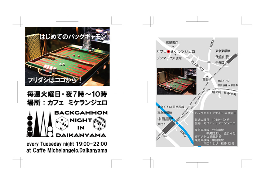自身の趣味であるバックギャモンのイベント会場で対戦相手の方に配布するカードの印刷原稿として仕上げました。