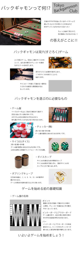 - 製作ノート:バックギャモンの入門者向けに紹介をする内容を簡潔にまとめました。まずはおおまかなゲームの遊び方のイメージと遊ぶのに必要なアイテムをひとつひとつ写真と共にわかりやすく解説することに留意しました。(下記、左側)