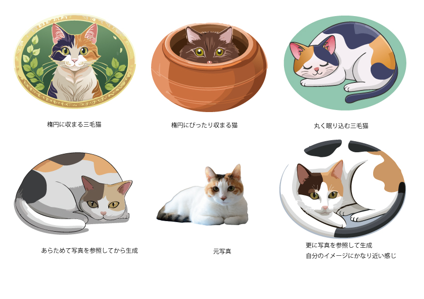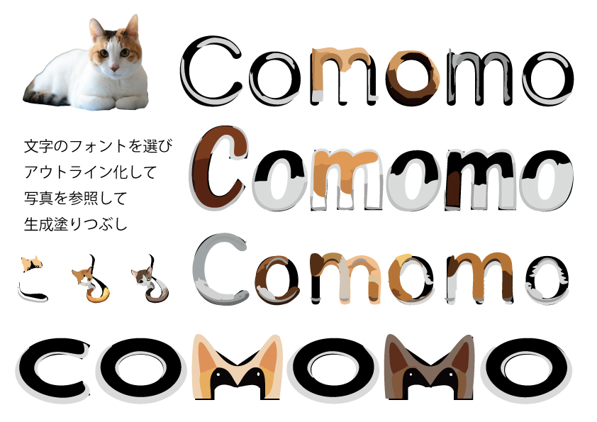 Portfolio_23『カメラと写真』Illustratorによる生成AIの実践③Portfolio_カメラと写真 生成AI:ミケネコの写真からイラストの生成と文字への生成塗りつぶし 作業時間:60分 製作ノート:ミケネコの写真を元に楕円形内に収まる形でプロンプトを入力しました。同じ写真を元に文字のフォントにミケネコのイメージでの装飾を生成AIで実行しました。いずれも他に転用可能な生成AIの使い方が出来たと思います。